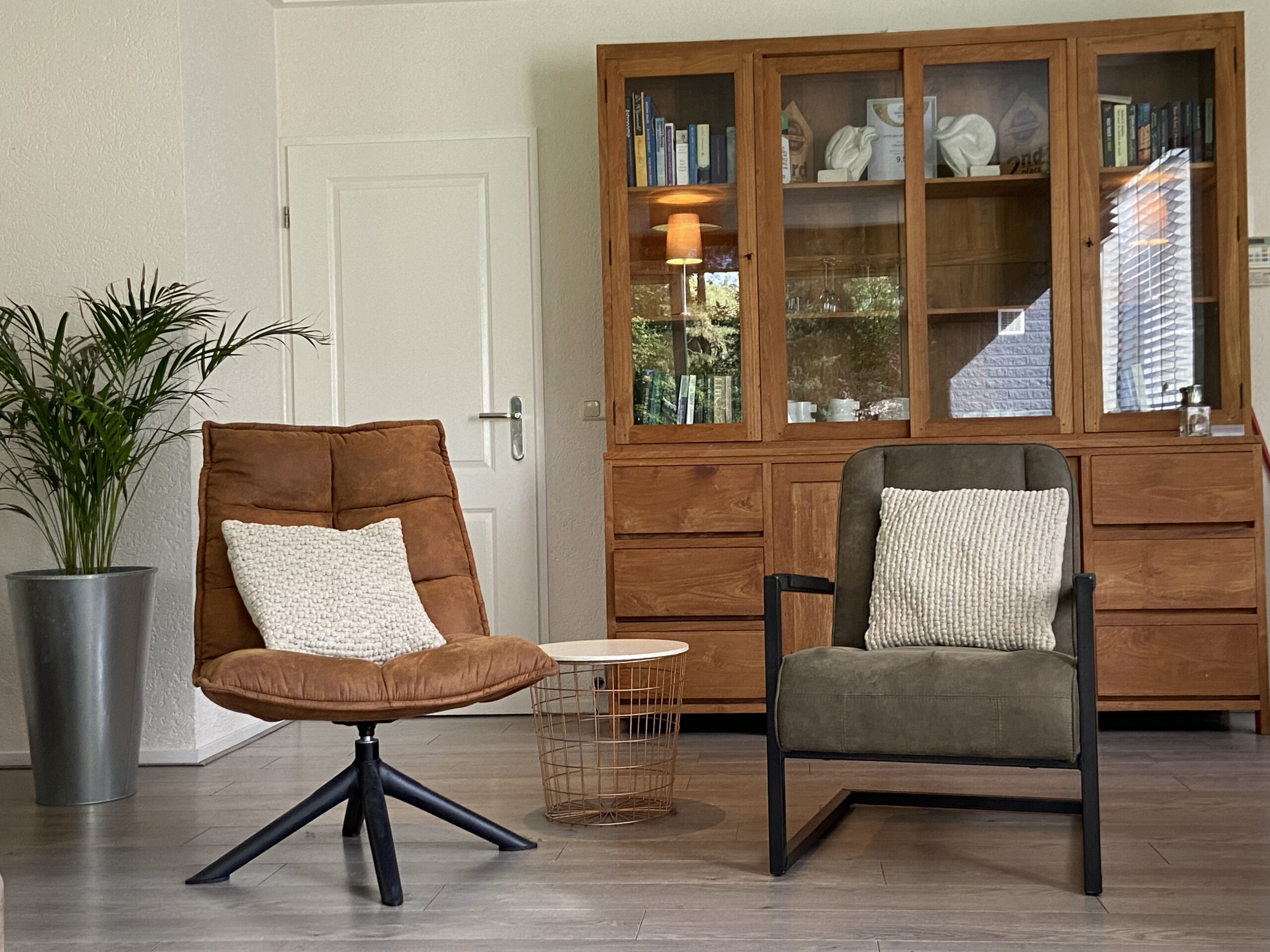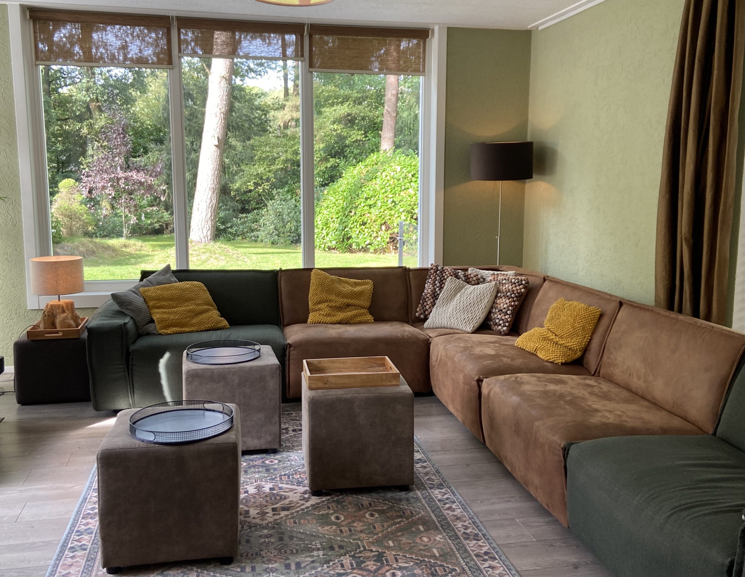 De begane grond, hier is het woongedeelte, bestaande uit woonkamer met ruime hoekbank, twee comfortabele stoelen en een houtkachel met een mooi uitzicht op de tuin, 40 inch televisie via glasvezel.