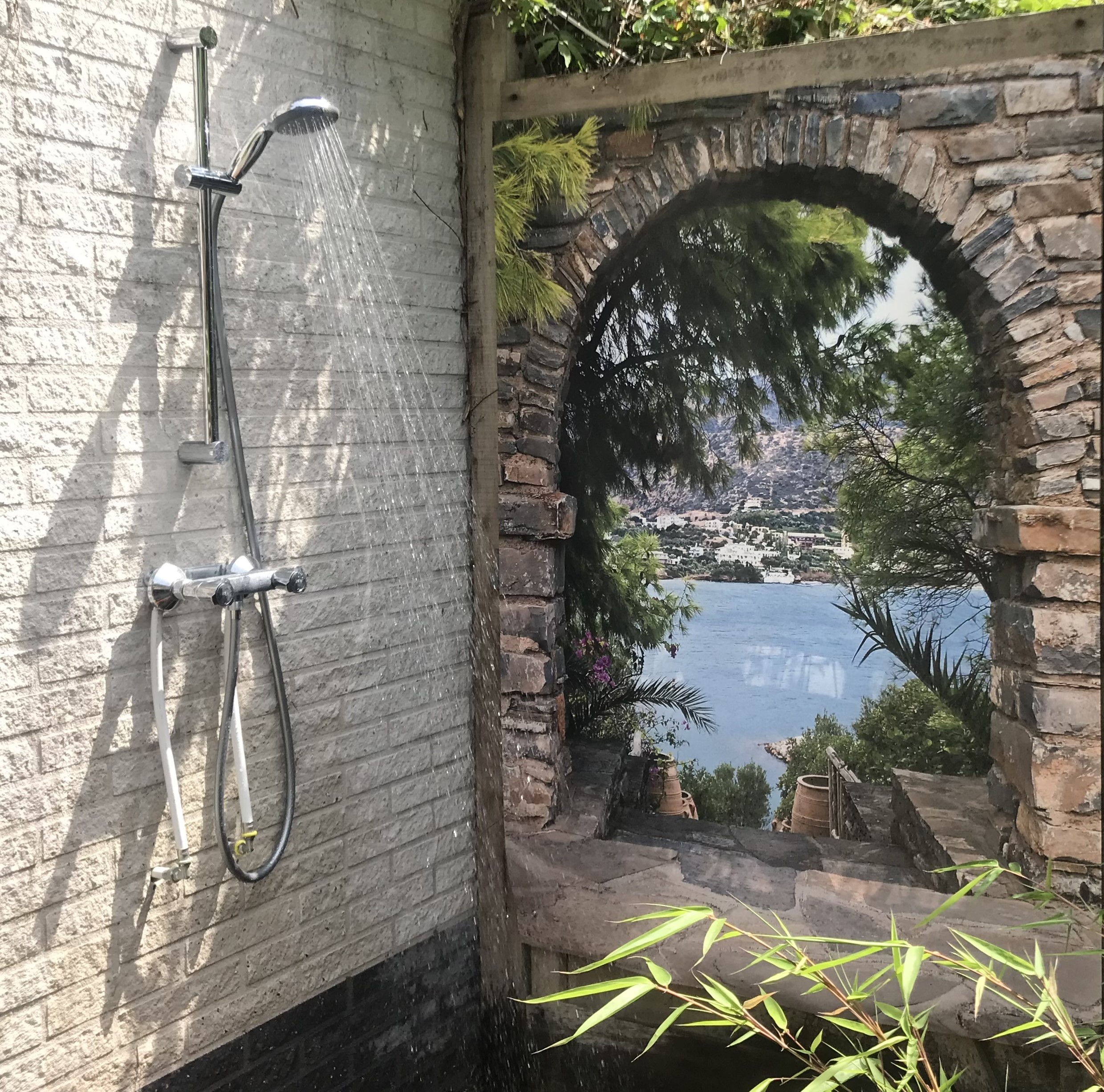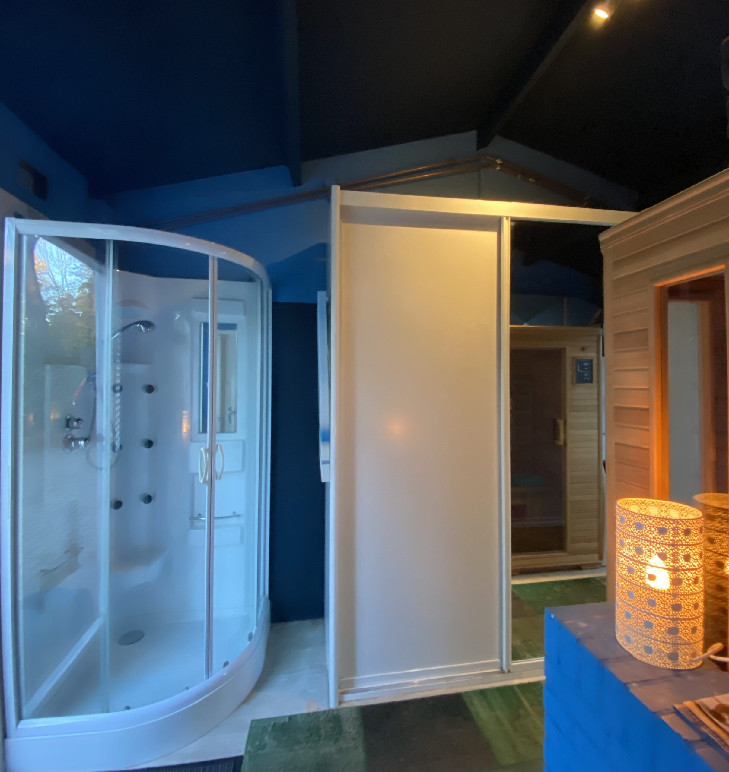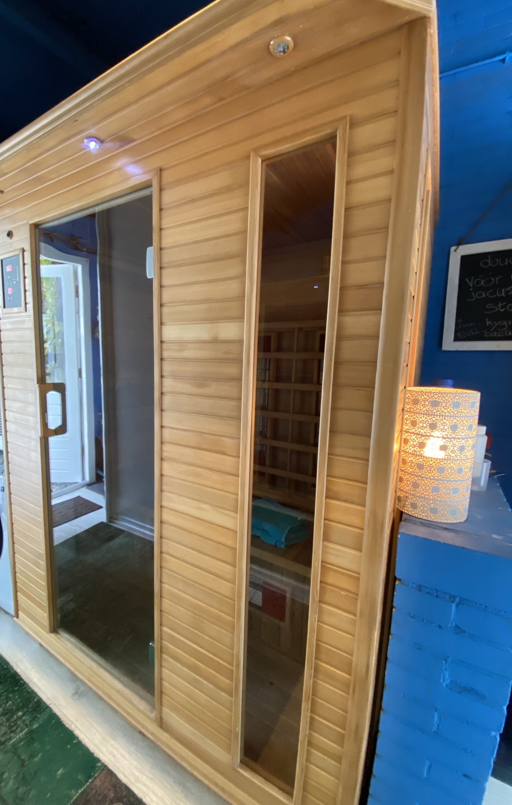 Sauna, met aparte douchecabine. Jacuzzi en een buitendouche met koud-warm water.