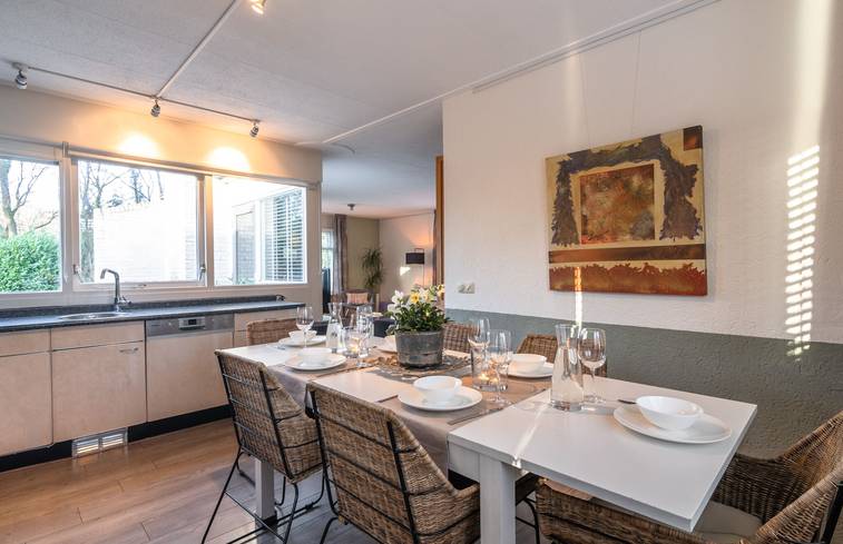 De open keuken met een ruime eettafel voor 6 personen heeft een uitgebreide keukenuitrusting.