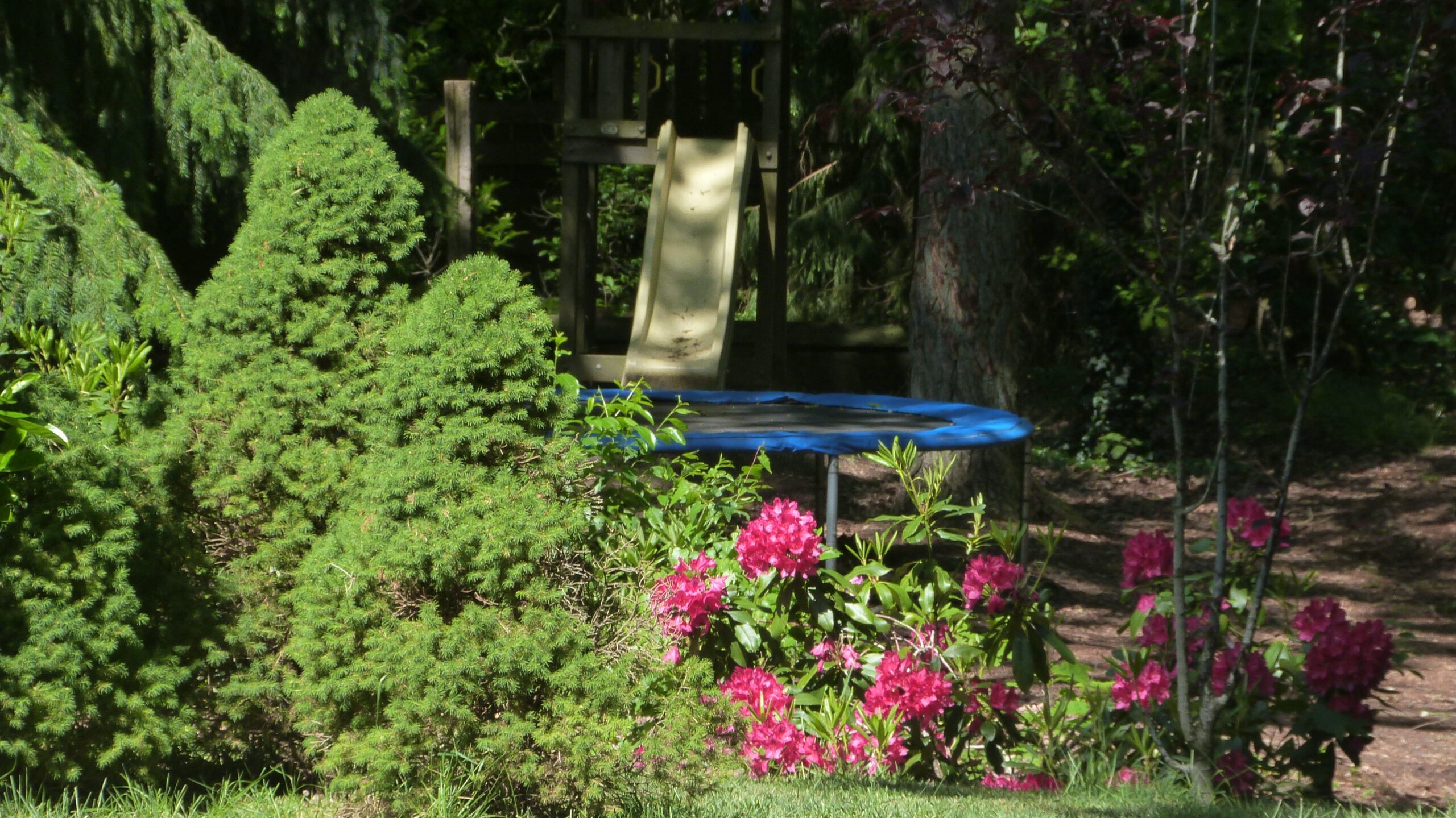 Voor de kinderen is een trampoline en een glijbaan in de tuin.