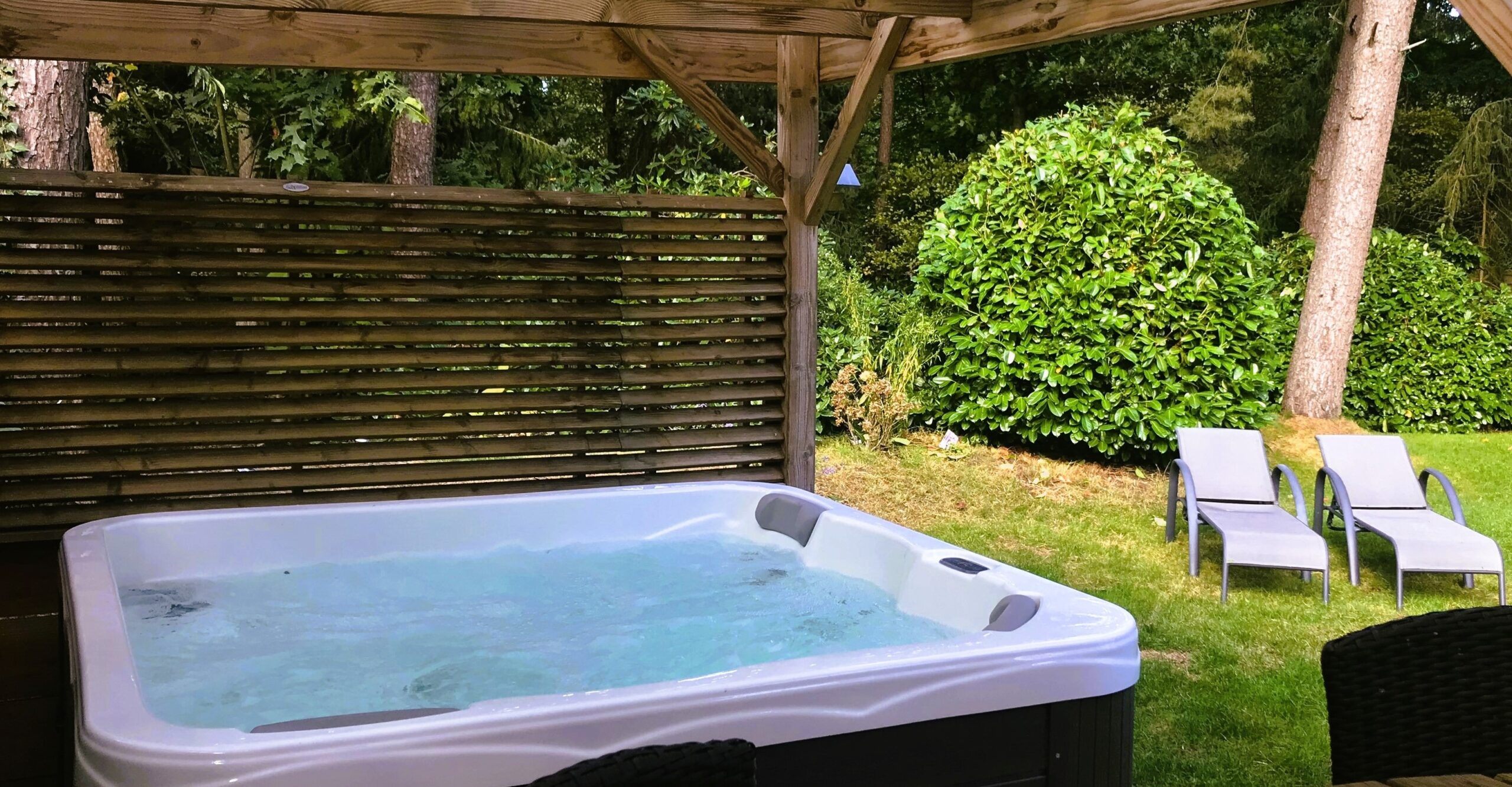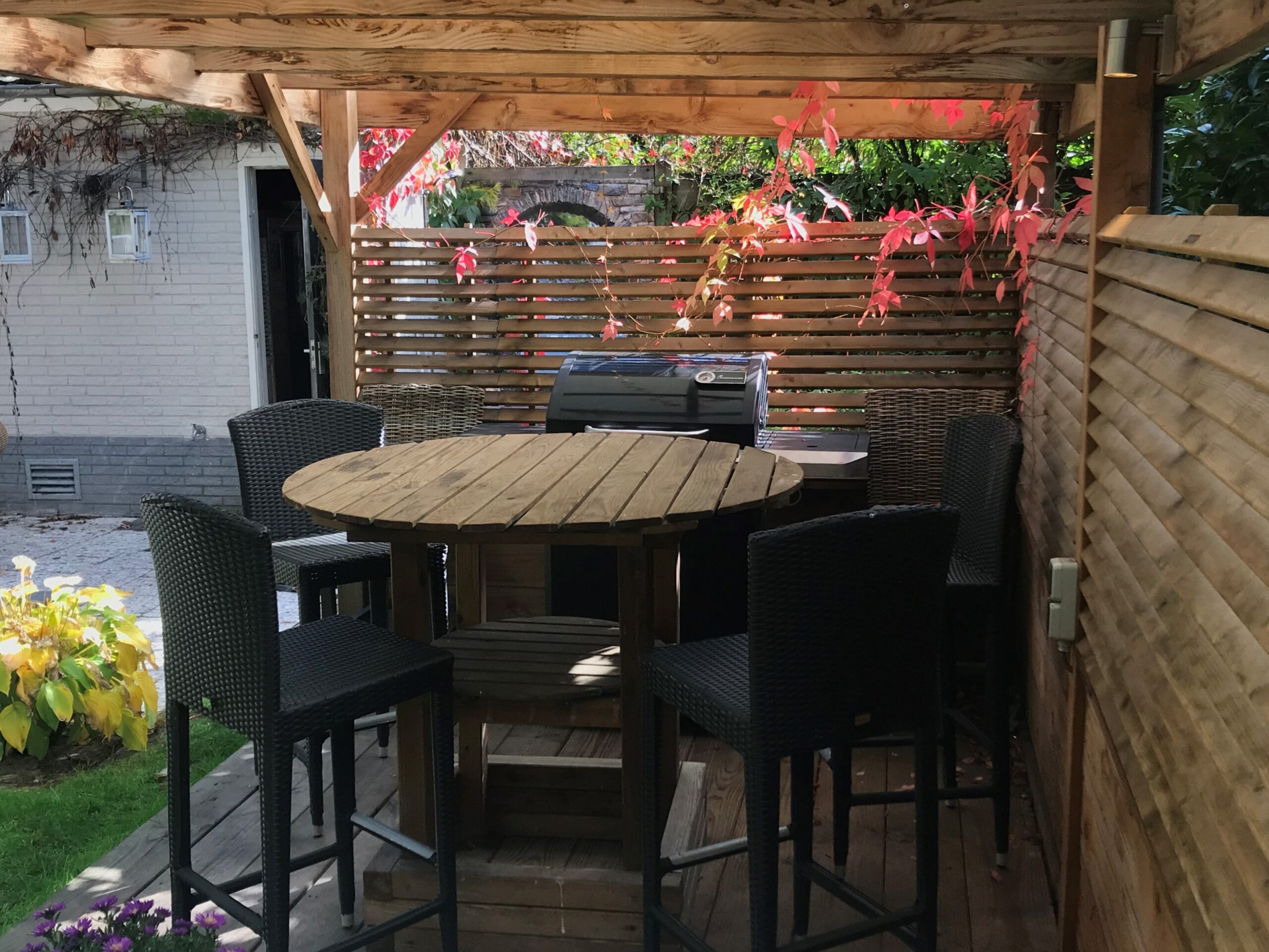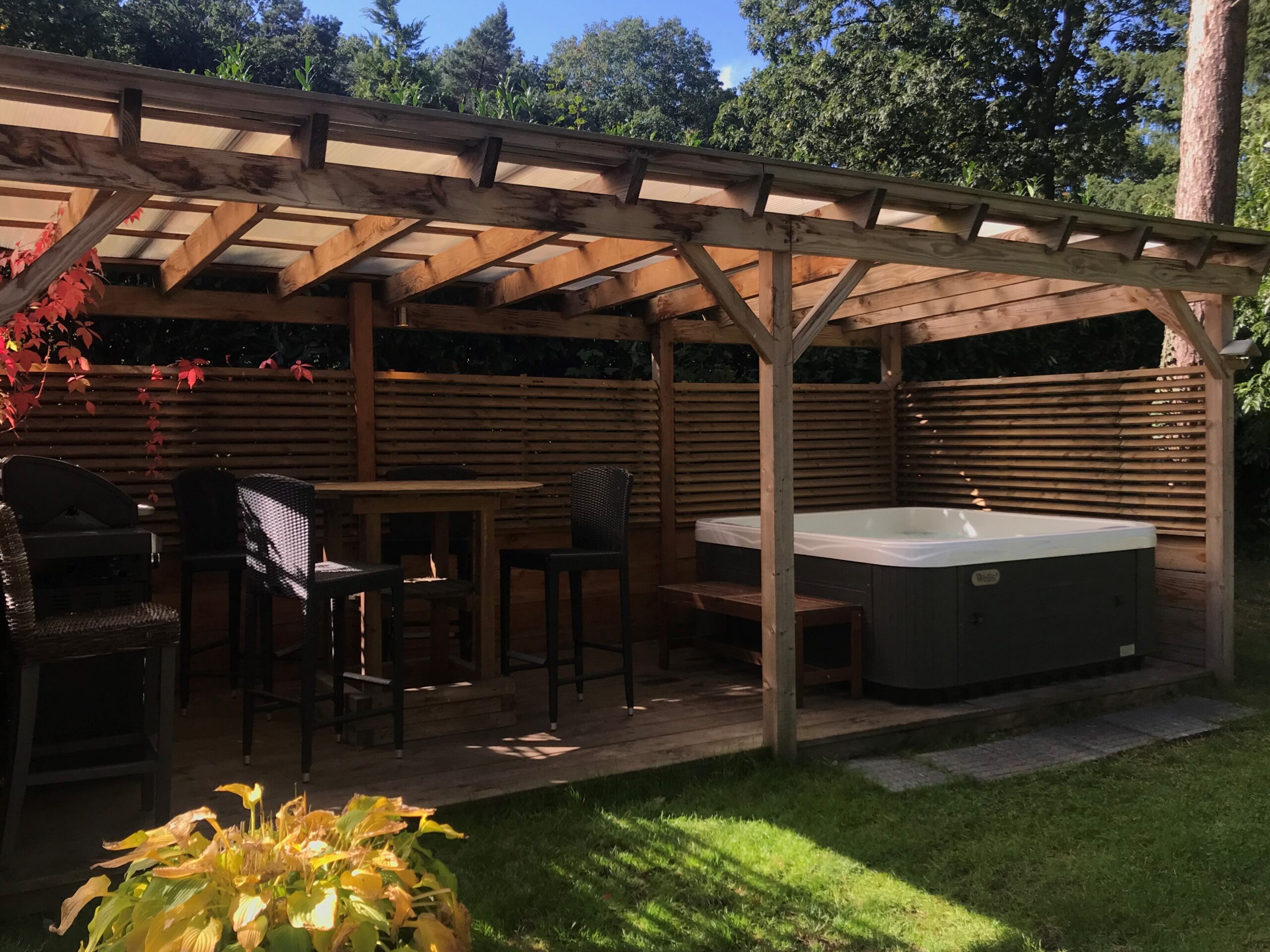 Naast het terras bevindt zich een grote veranda, hieronder staat de jacuzzi en een gas-BBQ met een bartafel.